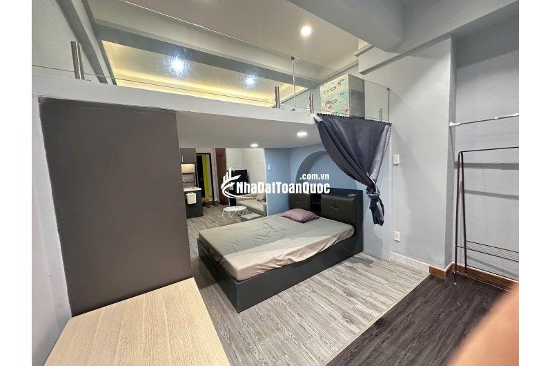 Căn hộ có gác lửng, diện tích 33m2 (diện tích sử dụng lên tới 50m2). Nội thất đầy đủ với máy lạnh 2 ngựa, tủ lạnh Electrolux, giường An Cường kèm nệm Thuần Việt 20mm, cùng hệ thống tủ âm tường rộng rãi.